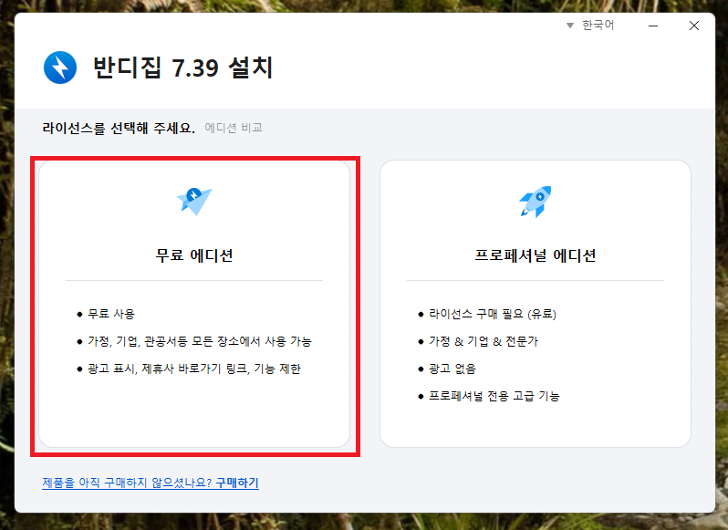 ▲ 반디집 설치 프로그램이 실행되면, [무료 에디션]을 클릭합니다.
